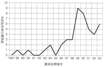日本測地学会の講演会では、どの程度女性研究者による発表があるのでしょうか? ためしに最近の秋の講演会のプログラムで調べてみますと、図50-1のように、確実に女性研究者による発表が増えています(2002年は国際会議とつづけて開催されたので、日本測地学会講演会の発表数は例年よりも少なかった)。図50-1のグラフは、増加傾向がいったん頭打ちになってからまた回復しているという点で、特に興味深いものです。これは、子どもの学習効果と同様、成長発達期の人や組織によく見られる傾向だからです。
